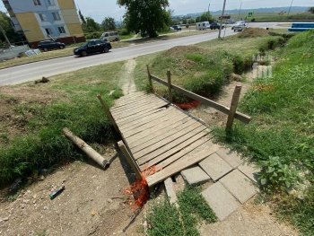 Жители Буденного, 19, продолжают дышать пылью, которую разносит из вырытой траншеи. Через траншею соорудили деревянный мост. Доски на мосту частично провалились, — передает Керчь.ФМ.
