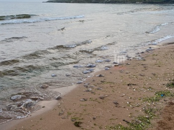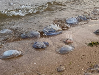 Под Керчью, в Юркино, на берег пляжа выбросилось большое количество медуз, под которыми начали гнить водоросли, — передает Керчь.ФМ. Температура воды у побережья +32 градуса.
