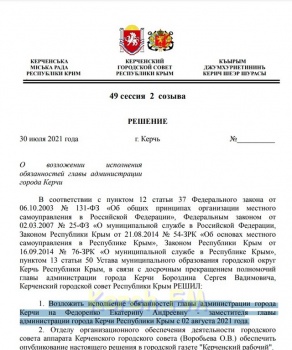 « Досрочно прекратить полномочия главы администрации города Керчи Бороздина Сергея Вадимовича 30 июля 2021 года в связи с отставкой по собственному желанию.