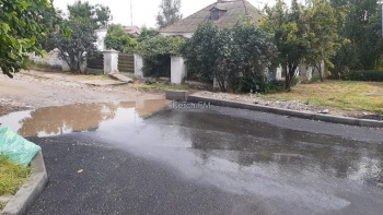 Огромные лужи после небольшого дождя образовались прямо перед новоуложенным асфальтом - вода перестала уходить, ей просто некуда.