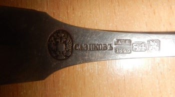 Старинный столовый прибор весит 100 грамм. На лицевой части изделия выгранены буквы «АЧ», на обратной стороне ложки присутствуют клейма в виде герба Российской империи и Святой Георгий, а также надписи «Сазиковъ» и «АК 1846».