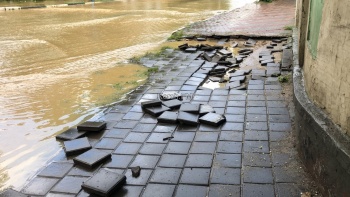 Так, дорога от СРЗ перекрыта. Проезжая часть у исполкома затоплена, легковой автомобиль не пройдет. Рабочие чистят левнёвки, говорят, что с утра здесь столько воды не было. У торгового порта вода, по сравнению с ночью, сходит. Но проезд все еще перекрыт. Пройти и не намокнуть не получится - вода суть ниже колена. Здесь и арбузы, которые потоком принесло с оптового рынка.