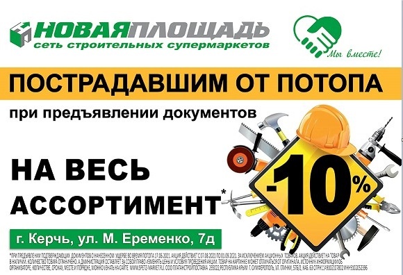 В связи с выпадением аномального количества осадков, строительный магазин «Новая площадь» предоставляет скидку -10% на весь ассортимент продукции, за исключением материалов для сухого строительства, цемента, добавок к бетону, теплоизоляции, акционных товаров, скидка на которые не дублируется. Данную скидку можно получить в период с 9 по 31 августа, предъявив документы, подтверждающие нанесенный ущерб: для частных лиц - акт обследования жилого помещения, для ИП или ООО - акт обследования жилого помещения / справка о пострадавшем объекте.