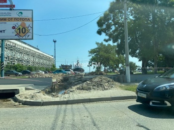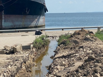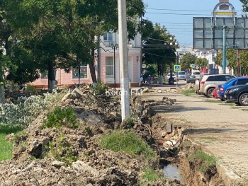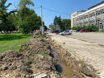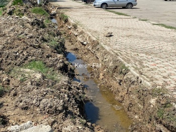 Новая ливневка пройдет по траншее, которая была прорыта в минувший понедельник между зеленой зоной и парковкой для ускорения стока воды с подтопленного участка улицы Кирова в районе судоремонтного завода.