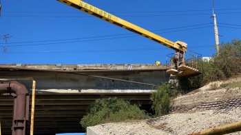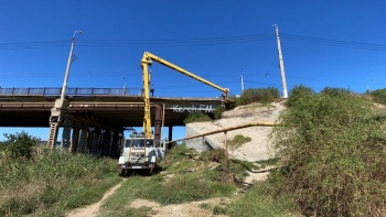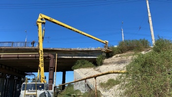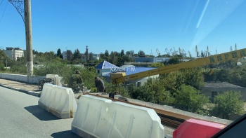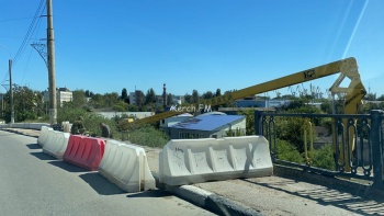 Сегодня, 8 сентября, на мосту рабочие устанавливают ограждение. Работы проводят с помощью спецтехники. Территорию оградили пластиковыми дорожными барьерами.