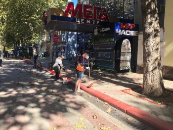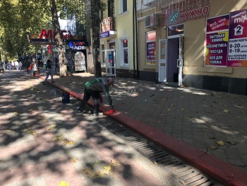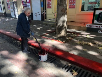 С утра 8 сентября работы идут по ул. Ленина. Бригада рабочих сначала очищает бордюры от пыли и листвы, а потом красит в яркий красный цвет.