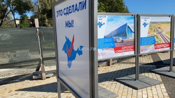 В Керчи на центральной площади города появилась необычная выставка. Министерство внутренней политики, информации и связи Крыма установило баннера, на которых решили показать, что сделали в Крыму. Среди этих объектов: открытие МФЦ, аэропорт Симферополь, трасса «Таврида», энергомост, Митридатская лестница и другие, - передает Керчь.ФМ.