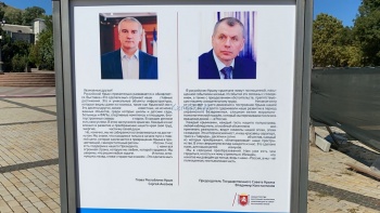 Кроме этого, стоят два баннера, на которых изображены Глава Крыма Сергей Аксенов и Председатель Государственного Совета Крыма Владимир Константинов.
