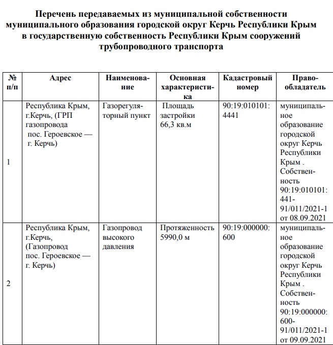В Керчи 21 сентября состоялась внеочередная 54 сессия Керченского городского совета 2 созыва. Одним из вопросов депутаты приняли решение о даче согласия на передачу из муниципальной собственности Керчи в государственную собственность Крыма сооружений трубопроводного транспорта, - передает Керчь.ФМ.