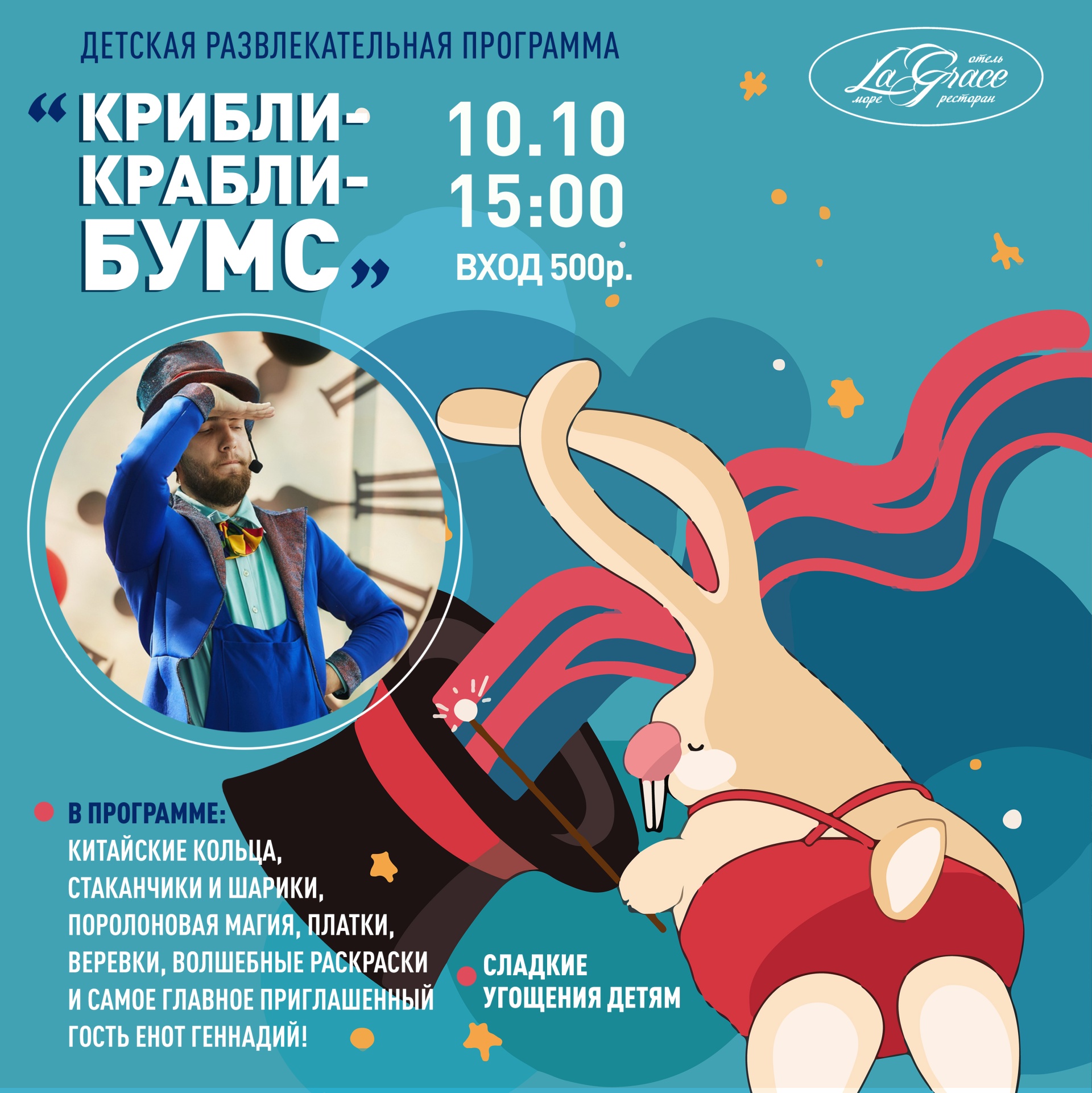 - 10 октября в 15:00 - детская развлекательная программа "Крибли-Крабли-Бумс" в исполнении фокусника-иллюзиониста Артура Пахольченко.