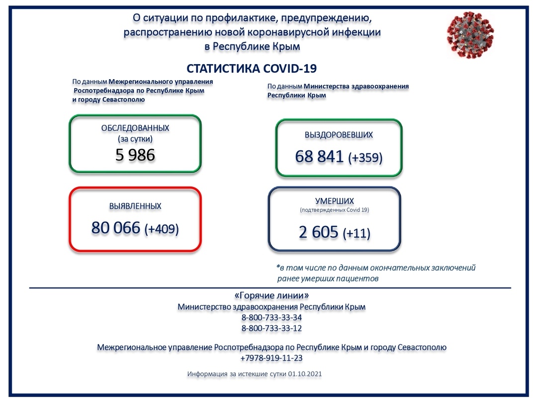 За последние сутки на коронавирус в Крыму обследовали 5986 человек. Еще 359 пациентов были выписаны, всего за время пандемии выздоровели 68 841 человек.
