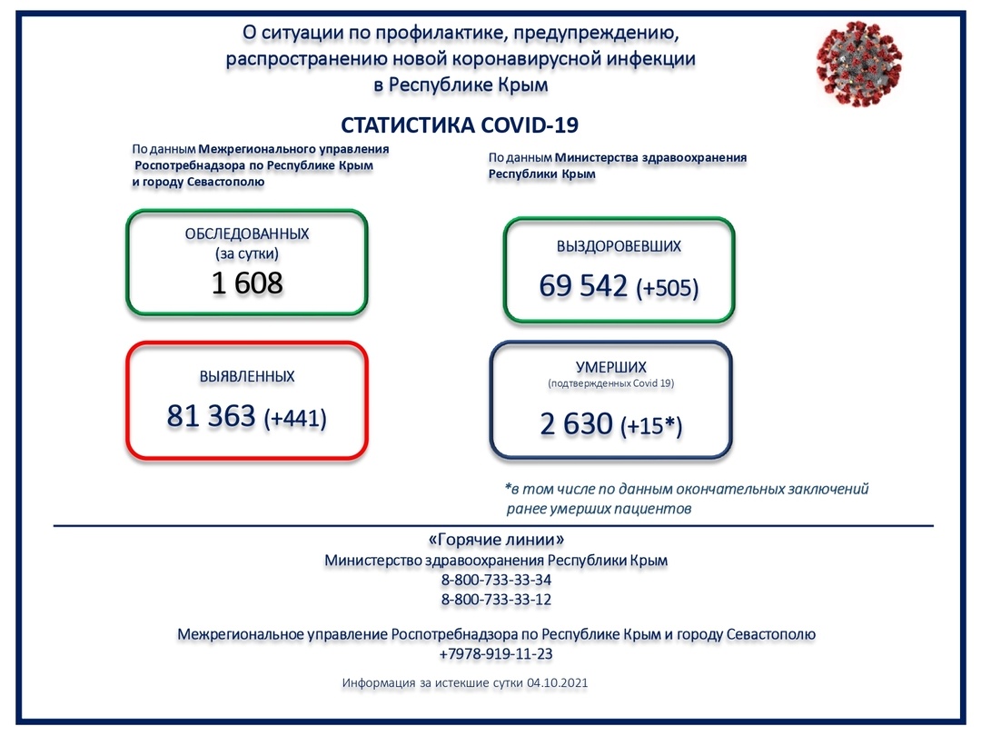 За истекшие сутки выявлен 441 новый случай COVID-19. Выздоровели 505 человек и 15 скончались. Обследование на новую коронавирусную инфекцию прошли 1 608 человек.