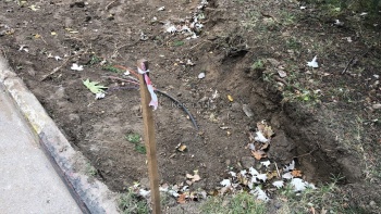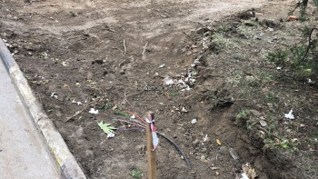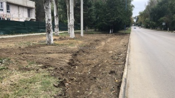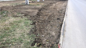 Работы здесь начали еще на прошлой неделе. Рабочие сняли слой грунта в двух местах, убрали некоторые деревья. Один из участков будущего заезда находится прямо посреди нового здания, видимо здесь будет центральный вход в сад. Бордюры пока не убрали.