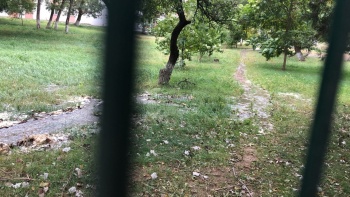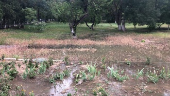 Сильным напором от места порыва вода стекает к корпусу университета и уже затопила часть прилегающей территории. К центральному входу вода не дошла из-за небольшого бордюра, но если напор воду и дальше будет с такой же силой, бордюр вряд ли спасет и студентам придется «плыть» на пары.