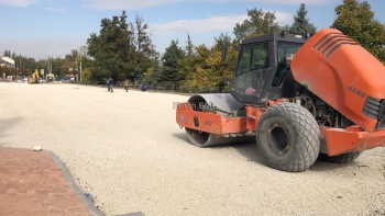 Так, рабочие завезли сюда щебень, теперь с помощью спецтехники его ровняют.