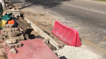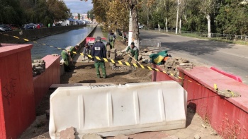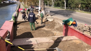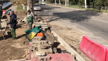 Так, рабочие уже завершили восстановление самого парапета. Сейчас здесь вновь укладывают тротуарную плитку, восстановили бордюры у дороги.