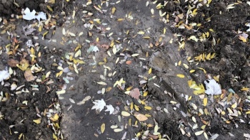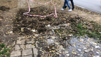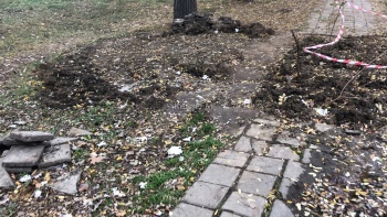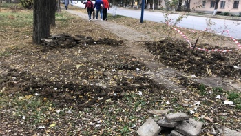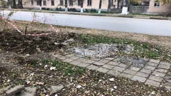Так, из-за порыва водовода здесь вели работы. Дорожку разрыли, трубу отремонтировали, место работ закопали, натянули сигнальную ленту. А плитку не восстановили.