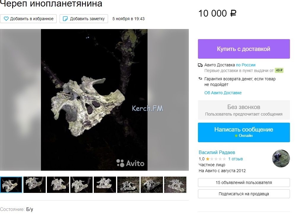 Керчанин выставил на сайте объявлений на продажу «череп инопланетянина» за 10 тысяч рублей, - передает Керчь.ФМ