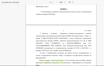 «Контракт № 9-ЕП Объекты закупки Благоустройство придомовой территории, расположенной по адресу: Республика Крым, г. Керчь, ул. Буденного д. 2/5» суд взыскал пеню в размере 8 832, 84 рублей, штраф в размере 60 000, 00 рублей за неисполнение обязательств по муниципальному контракту №09-Е задолженность в размере 80 101, 66 руб. руб., штраф в сумме 40 000, 00 руб. от 23.03.2021.