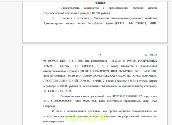 Напомним, Главу администрации Керчи вызвали в Следственный комитет. У правоохранителей возникли вопросы по поводу работы по поводу исполнения контрактов, заключенных с "Луксаром". Администрация расторгла контракты, но Луксар другого мнения. Администрация обвиняет ЛУксар в подлоге, но и здесь Луксар другого мнения. Похоже, что теперь другого мнения и арбитражный суд и вовсе не солидарного с администрацией города.