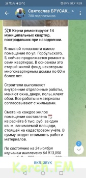 В то же время глава администрации Керчи Святослав Брусаков, отчитываясь в соцсетях о ремонте муниципальных квартир, пострадавших от потопа.
