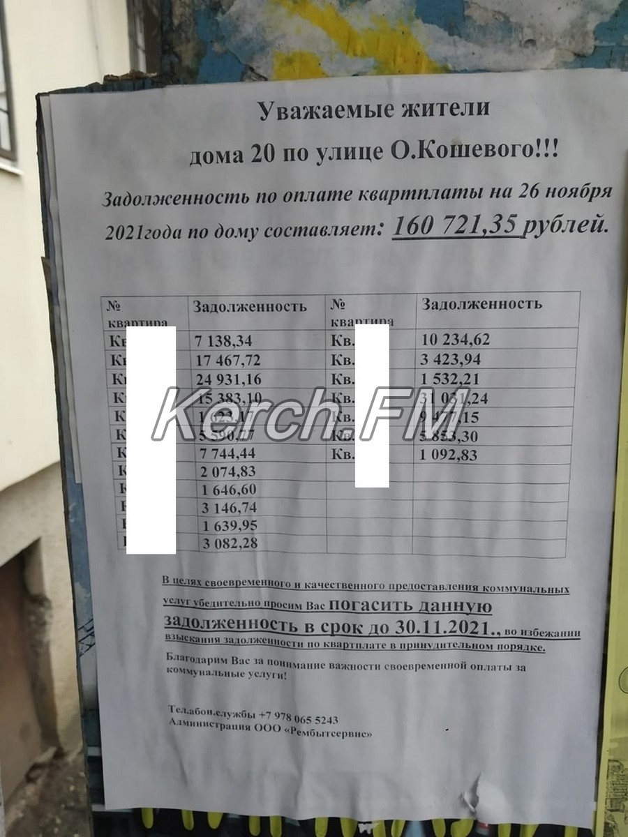 В редакцию Керчь.ФМ обратился постоянный читатель, которого очень удивило объявление о задолженности по квартплате в одной из многоэтажек Керчи. Дело в том, что указан не номер лицевого счета должника, а номер квартиры.