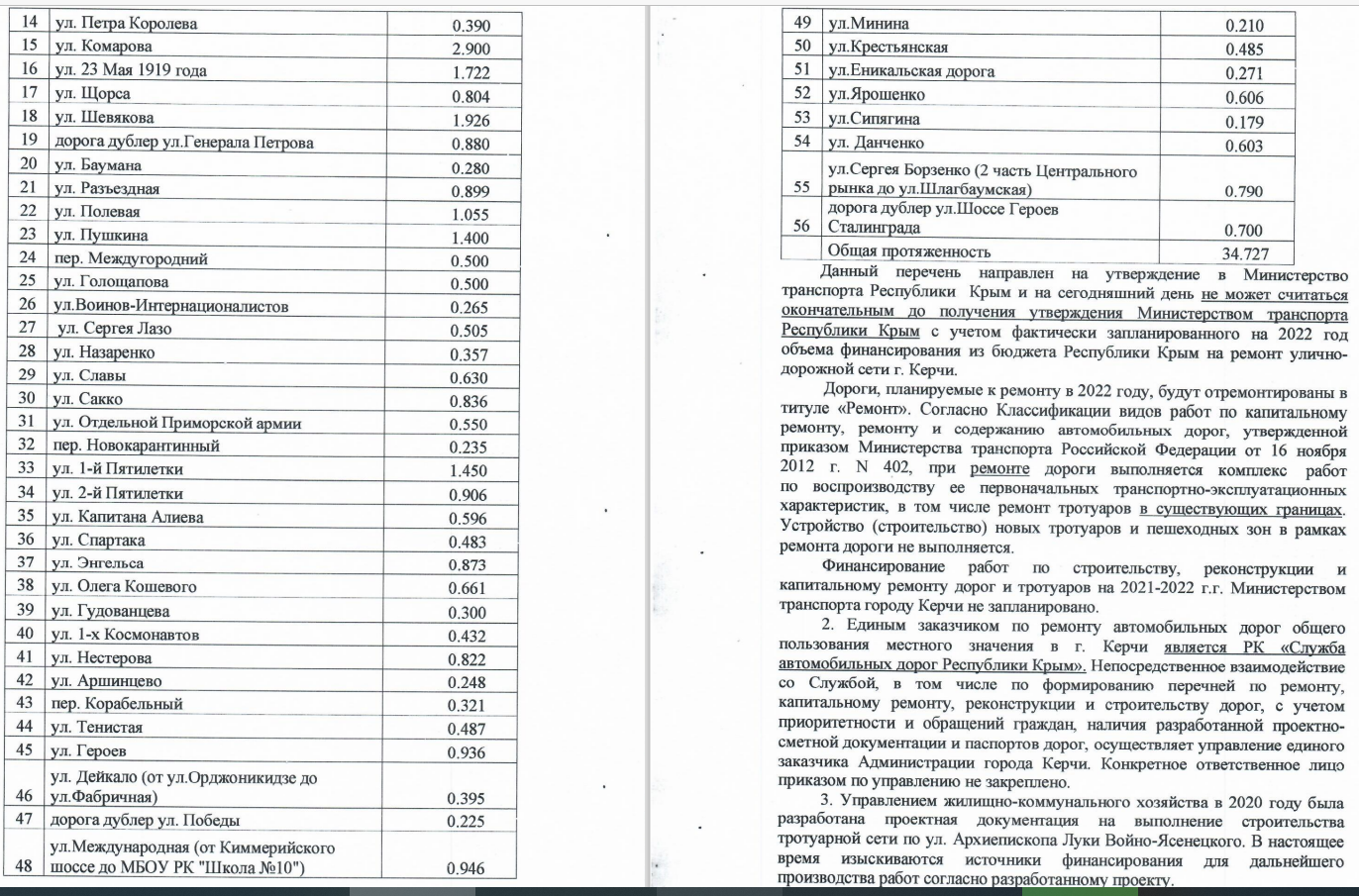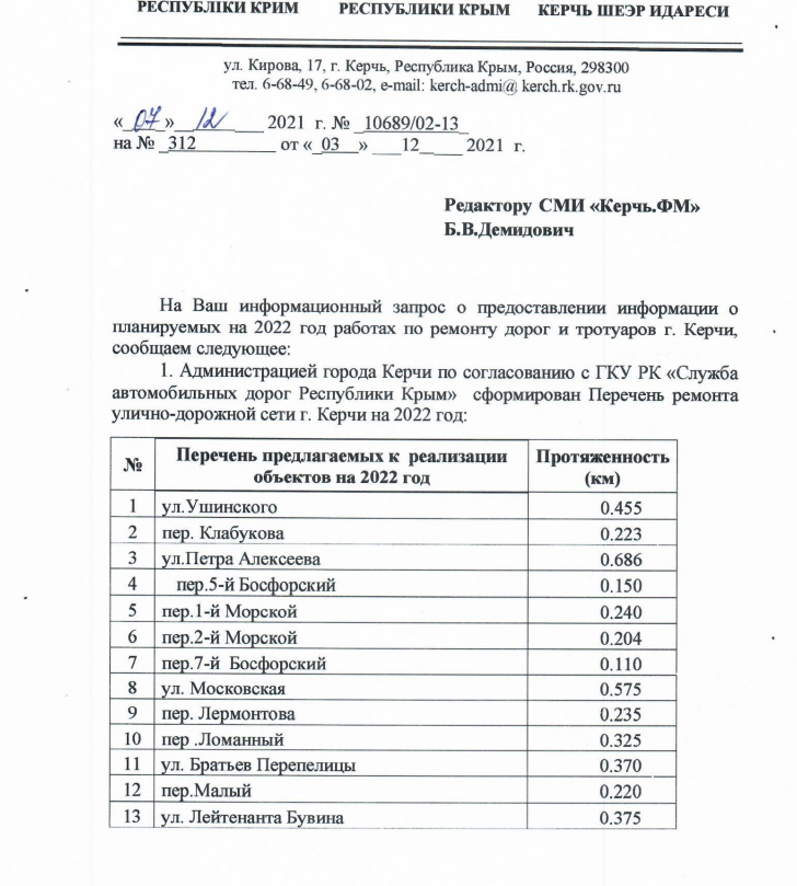Необходимо уточнить, что Администрация Керчи подала заявку на ремонт дорог, в том чиле к Еникале, но окончательное решение будет принимать Минтранс Крыма после получения полный информации о финансировании раобот. Читатели могут ознакомиться с ответом на информзапрос относительно ремонта дорог в 2022 году. Считаем эту информацию важной, так как наличие отремонтированных дрог поднимает качество жизни. В этом можно убедиться, пожив несколько дней на улице Большая в Капканах, где дорогу перекопали «вглину» 3 года назад в рамках программы по ремонту водоводов, но так все и оставили.