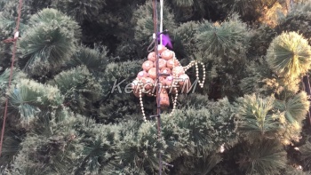 Так, часть игрушек сделаны из двух- и пятилитровых бутылок, обмотанных в целлофан. Есть игрушки из пробок от шампанского, бумаги. Все это на большой елке выглядит нелепо.