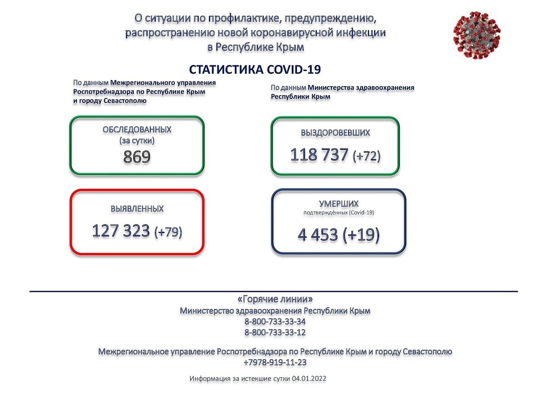 По данным Межрегионального управления Роспотребнадзора по Республике Крым и городу Севастополю за 4 января 2022 года на территории Республики Крым зарегистрировано 79 случаев новой коронавирусной инфекции, всего выявлено 127 323 положительных на Covid-19. Об этом сообщает пресс-служба Минздрава Крыма, - передает Керчь.ФМ.