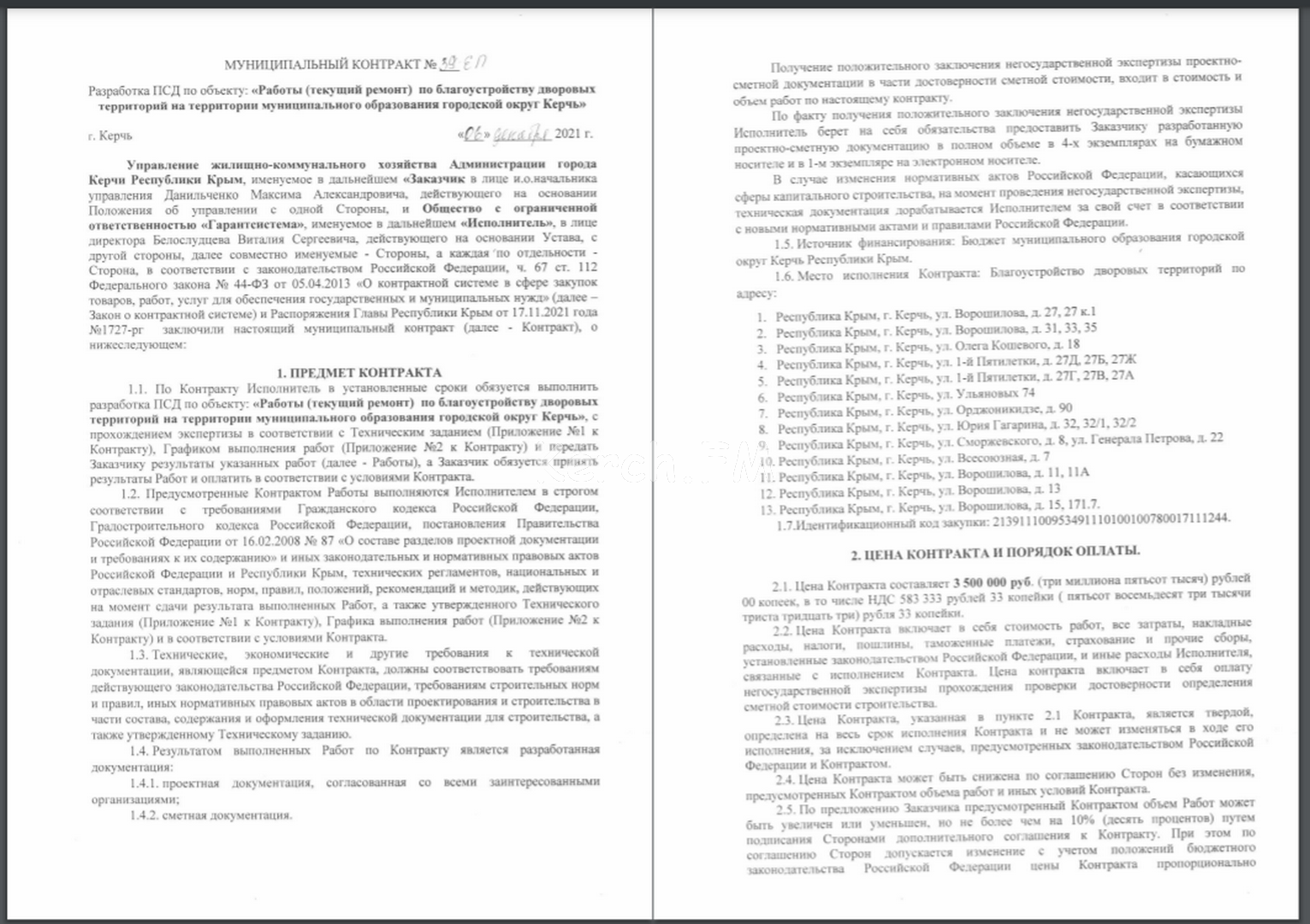 Сергей Аксенов своим Указом от 17 ноября определил ООО «Гарантсистема» единственным поставщиком услуги по разработке проектно-сметной документации по объекту: «Работы (текущий ремонт) по благоустройству дворовых территорий на территории муниципального образования городской округ Керчь» (далее - Контракт), с ценой Контракта 3 500 000 (три миллиона пятьсот тысяч) рублей 00 копеек.