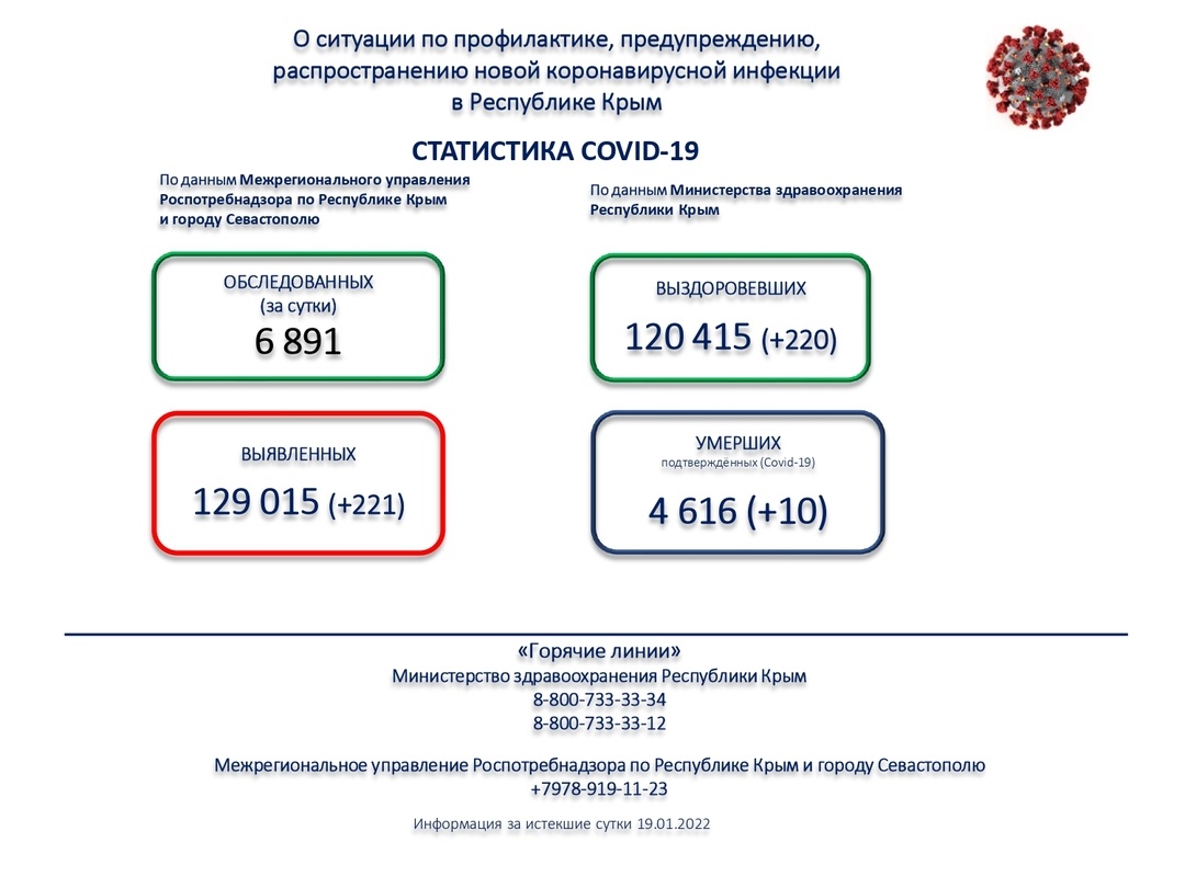 По данным Межрегионального управления Роспотребнадзора по Республике Крым и городу Севастополю за 19 января 2022 года на территории Республики Крым зарегистрировано 221 случай новой коронавирусной инфекции, всего выявлено 129 015 положительных на Covid-19. Об этом сообщает пресс-служба Минздрава Крыма, - передает Керчь.ФМ.