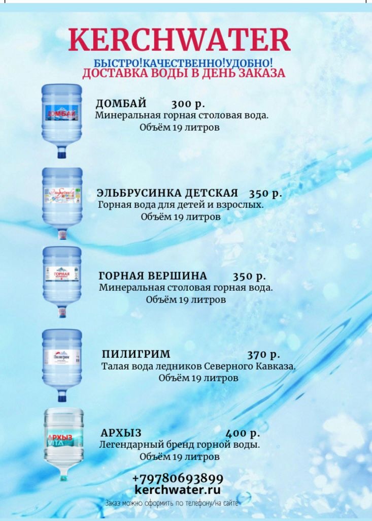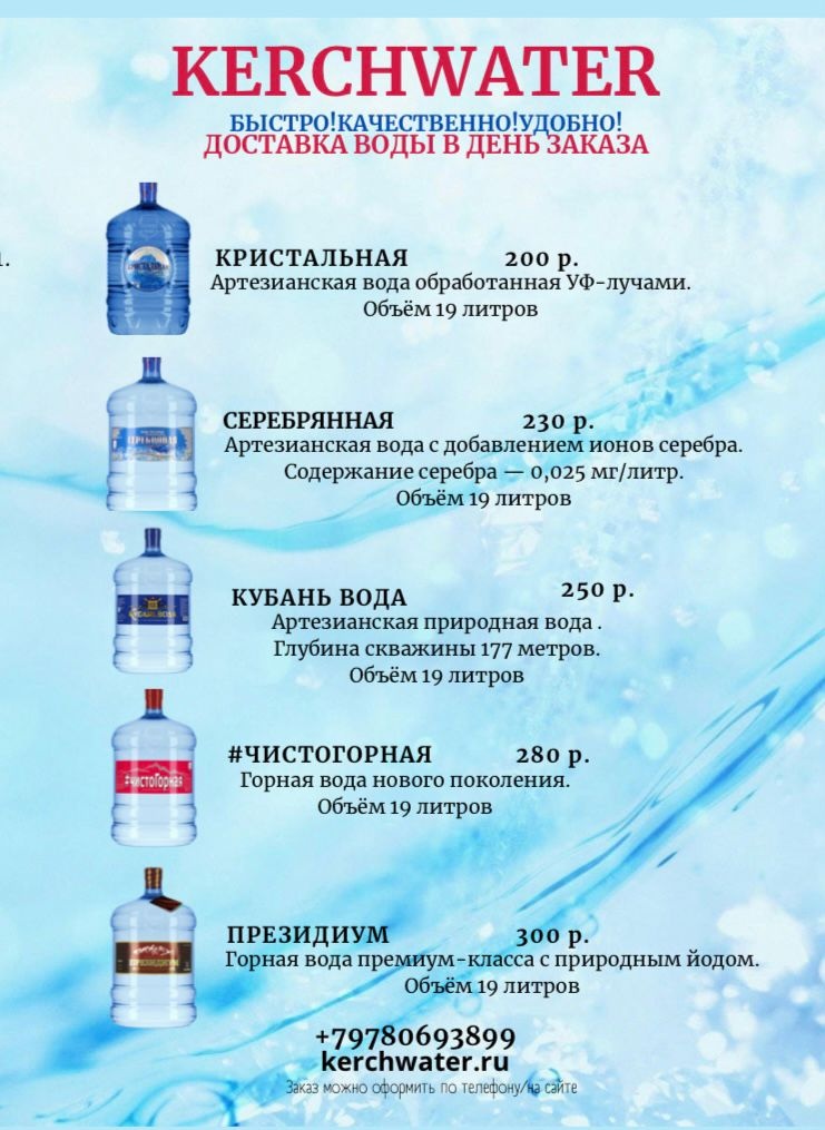 Компания KERCHWATER предлагает более 10 видов питьевой воды! Артезианская, горная, ледниковая талая! Вы можете выбрать именно ту, которая подойдет вам!