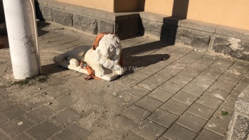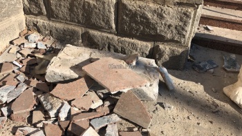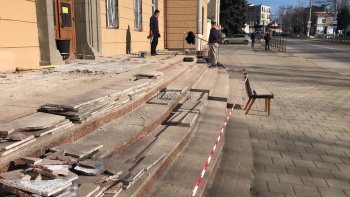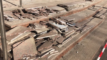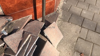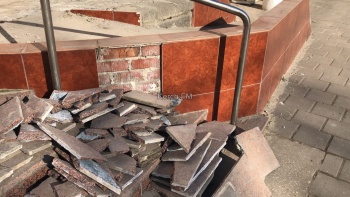 Двух львов, «охранявших» вход по бокам, сняли и положили рядом с ремонтными работами. Часть лестницы оградили стулом и сигнальной лентой. Рабочие с помощью перфоратора разбивают гранитную плитку и складывают у основания в кучи. Лишь немного плитки остается целой.