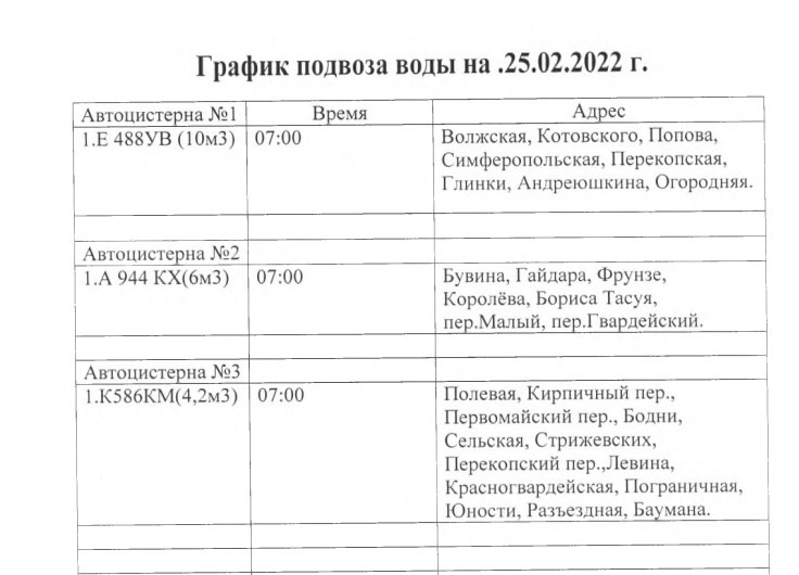 Керченский водоканал сообщает график подвоза воды на те улицы, которые из-за работ останутся 25 февраля без воды, - передает Керчь.ФМ.
