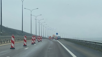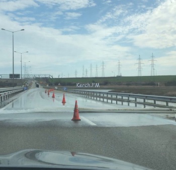 После сильных осадков обочины со стороны Крыма и со стороны Тамани начали «ползти». Отметим, еще хуже ситуация произошла в начале автоподходов на Кубани, там одна полоса местами затоплена водой. Воду оттуда откачивают с помощью техники.