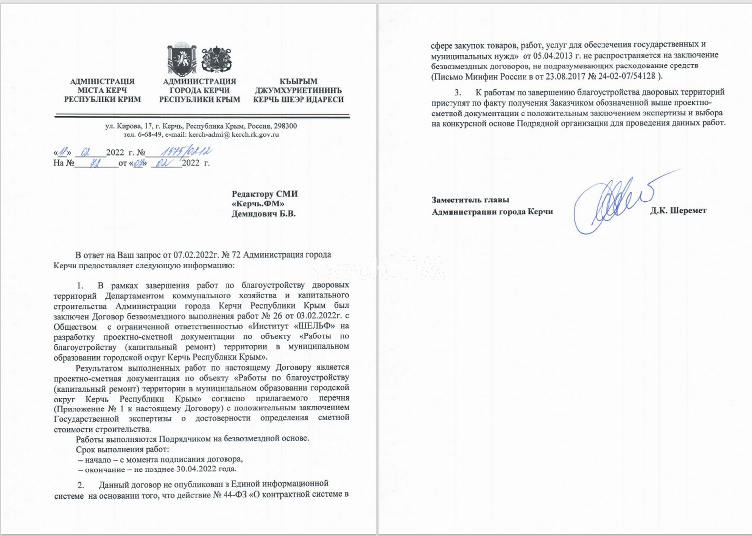 Договор не опубликован на сайте Госзакупок, так как договор безвозмездный. Таким образом заранее посмотреть, что учли проектировщики и какие выводы сделали, чтобы не допускать старых ошибок, ни редакция ни керчане не смогут.