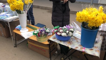 Есть и подснежники в продаже, но цену не узнать: женщина, увидев камеру, говорит, что продавец именно этих цветов отошёл.
