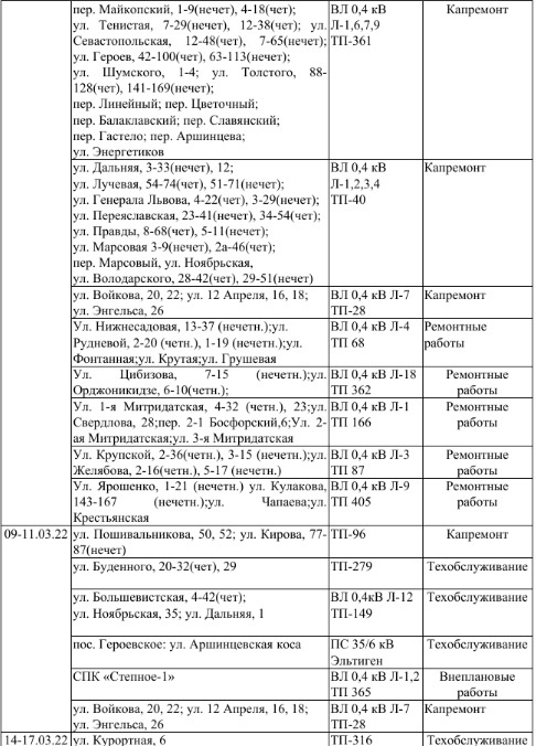«ГУП РК «Крымэнерго» сообщает о том, что в связи с плановым ремонтом электрооборудования в марте в период с 8 до 17 часов будут происходить отключения линий электропередачи согласно нижеприведенному графику.