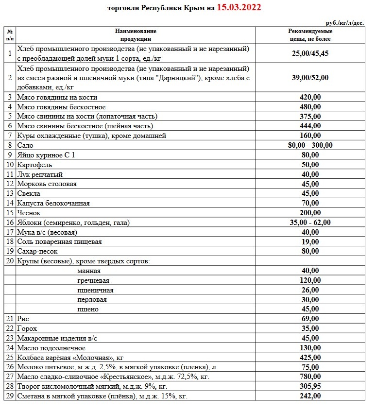 Министерство промышленной политики Крыма опубликовало рекомендуемые социальные цены на продукты питания, в том числе гречку и сахар. Документ размещен 15 марта на портале правительства республики, - передает Керчь.ФМ.