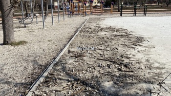 Стоит отметить, что на детской площадке под игровыми элементами потрескался цемент.