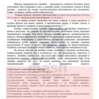 Так, опубликованы документы, с рекомендациями по проведению таких линеек. Длительность — 10-30 минут. Содержание должно быть доступным, актуальным, этичным и не пропагандистским.