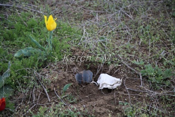 Здесь мы нашли кроме тюльпанов и мусор, и остатки крылатой мины, а может и целую: трогать не стали, мы не специалисты определить, безопасна ли она. Кто-то из посетителей указал место маской, чтобы люди случайно не наступили на нее.