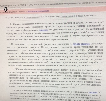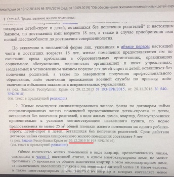 Редакция подняла базу судебных решений по искам прокуратуры Керчи в интересах детей-сирот по вопросу предоставления им благоустроенных квартир. Там, ссылаясь на все ту же ст.8 ЗРК 46, суд выносил законное решение, об обязании предоставить администрацией Керчи квартиры не менее 25 кв.м. Более того редакция обратилась в прокуратуру, где ей подтвердили, что в 2014 году, когда принимали закон об обеспечении детей-сирот и приравненных к ним квартирами действительно была норма 33 кв.м., но в декабре 2015 года внесли изменения в статью, заменив 33 квадратных метра фразой «не менее 25 кв.м».