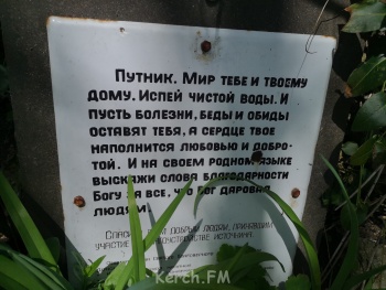 "Путник. Мир тебе и твоему дому. Испей чистой воды. И пусть болезни, беды и обиды оставят тебя, а сердце твое наполнится любовью и добротой. И на своем родном языке выскажи слова благодарности Богу за все, что Бог даровал людям.