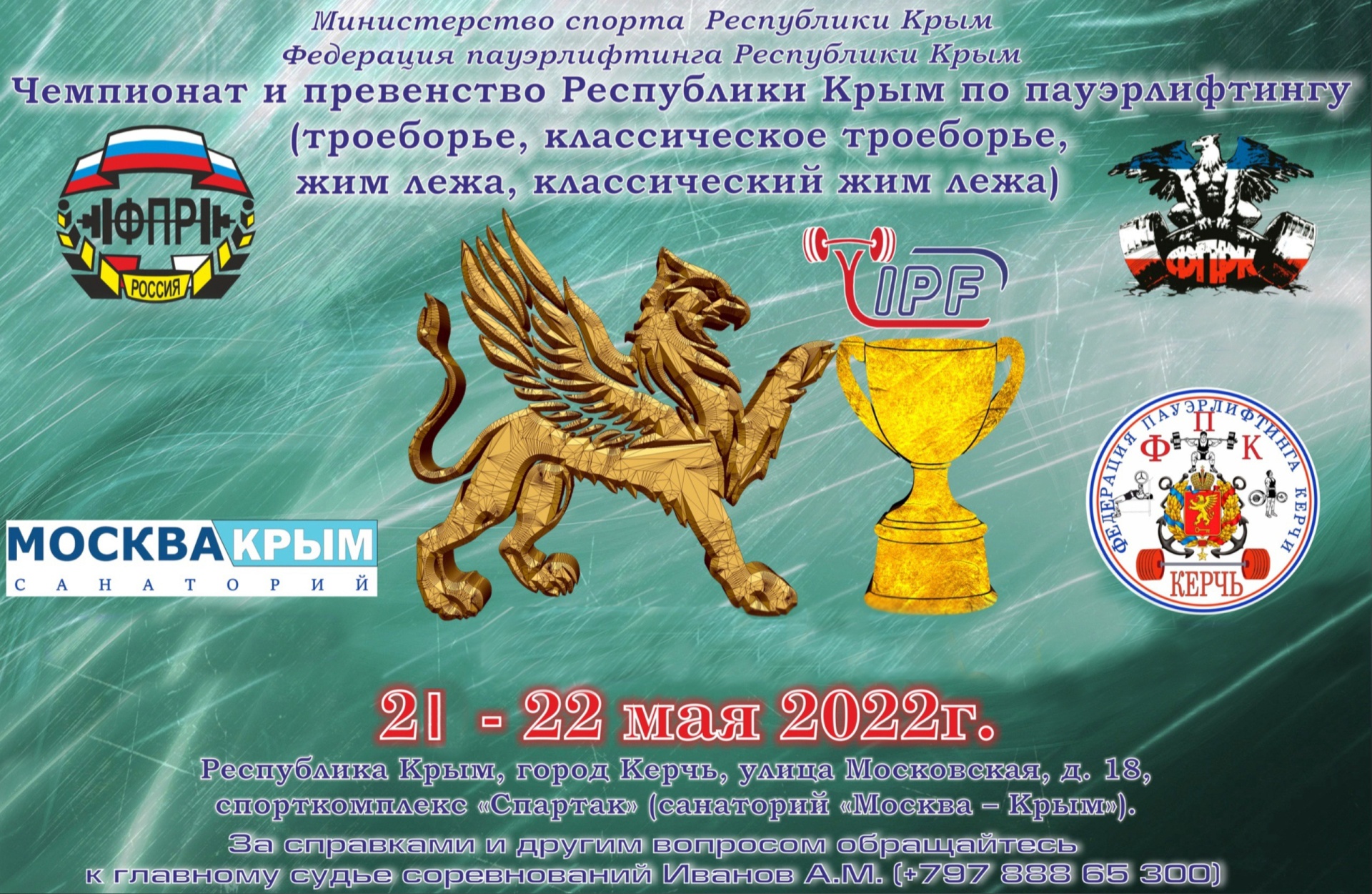В Керчи 21-22 мая 2022 года пройдет Чемпионат и первенство Республики Крым, а также региональные соревнования среди ветеранов и классическому жиму. Об этом Керчь.ФМ сообщили организаторы.