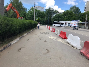 Это сделали из-за крупногабаритной техники, которая задействована в благоустройстве территории. Движение по дороге не мешает, а вот пешеходов радует - поскольку через ДК пройти невозможно и люди передвигаются обычно по проезжей части.