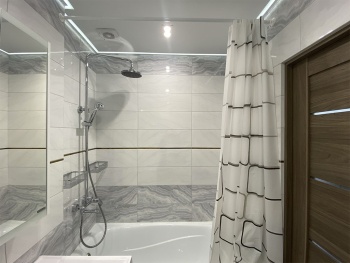 Применили наиболее вместительную расстановку сантехнических приборов и сместили проем для двери под новую планировку. За счет лаконичных декоративных элементов создали нескучный образ.