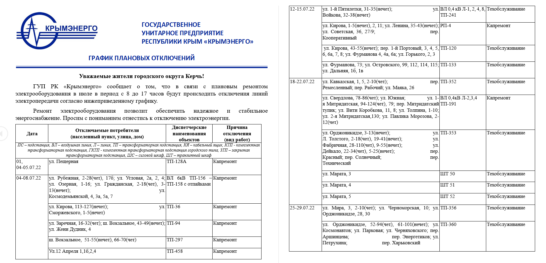Крымэнерго сообщило о плановых отключениях электроэнергии на июль 2022. О этом сообщила пресс-служба ведомства, - ппередает Керчь.ФМ.