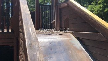 Отметим, кроме самого кораблика ремонта требует и горка, на которой торчат жестяные листы. Кроме того, и съезд с неё ведёт в острые камни. Сама территория у детской площадки также требует благоустройства, впрочем, как и вся набережная