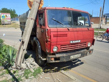 По информации очевидцев водитель КамАЗа уходил от ДТП и допустил наезд на опору. На место вызвали сотрудников полиции.